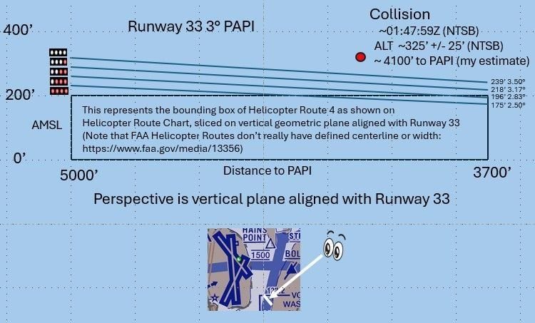 Look at this excellent analysis below. If its right, you can see that if the CRJ was on glide slope it would have been at about 240ft and indeed anywhere in the PAPI range. The actual altitudes on the day brought about where the crash actually occurred, but it was the route design that brought them there in the first place, and nearly did on many other days in the past decade or so that we know about.