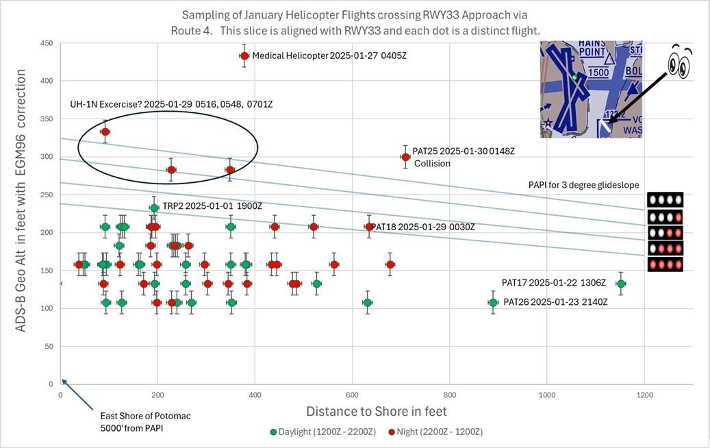 I’m not sure your quoting FAA helicopter routes as having no defined centreline or width would strictly apply in DC versus what they wrote about the North Shore of Long Island route in NYC where they are required to be 1 mile off the shoreline. As shown on the published helo chart (DIBO’s post #863, and your little chart insert) and in writing (BuzzBox’s post #998) Route 4 directs traffic to track “via the east bank of the Potomac” from the Wilson Bridge to Anacostia River. If the impact point was 1000 feet or so (give or take some trig) from the east bank of a 3000 feet wide river at that point wouldn’t this mean that PAT25 was not only too high but off track too? Otherwise according to your graphic even at 200 feet max elevation, being that distance from the east bank any helicopter not maintaining visual separation could collide if an AC was still positioning itself from being low on the glideslope.