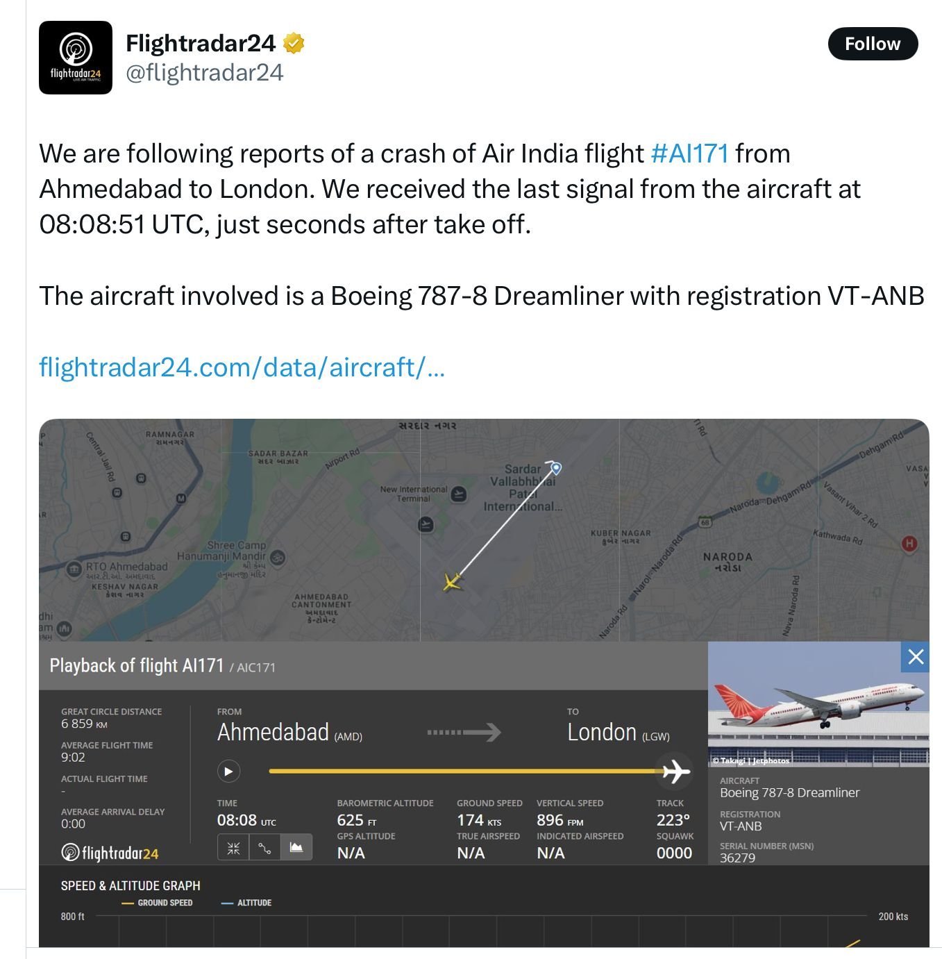 Takeoff config warnings and checklists may not have helped if the flap setting was not enough given the weight and conditions. A good handling pilot could recover from an incorrect flap setting (providing there's no obstacles to deal with), by gently lowering the nose allowing the airspeed to build up before resuming the climb. However, various human factors such as startle and over reliance on automation (my thrust setting must be good) will not help the situation. In order of likelihood: 1.) Flaps moved instead of gear 2.) Incorrect Flap settings and inability of crew to recover from that 3.) Double engine failure 4.) Some electrical event that distracted them TE Flaps are extended, flap gaps between the wing and the flap element are observable. This is not an aberration of the spoiler position, you can see the nacelles through the gap, and that means the flap can not be in the retracted position. An error of the TE flap deployed position, say between flaps 5 or 15 is not going to cause a stall event. The flap has not been retracted instead of the gear. Double engine failure... India. birds, always a latent threat. No rudder deflection, no aileron deflection, so it's not a SE problem, any engine issue is affecting both engines. Pitch control and roll is not compromised in the video. The crew put out a mayday, not sounding like an electrical fault or distraction. any funerals near by? Incorrect TO thrust setting would not present in the video as recorded. Low thrust results in low acceleration, and extended distance to rotate. after rotate, low thrust results in low climb rate, and can result in the crew over pitching where the aircraft has obstructions that the crew have to avoid. the video appears to show the pitch increasing at a point where the aircraft is already unable to climb, not the other way round. An outside possibility. For survivors, any from the aircraft will be a miracle, and mainly from the rear of the plane near door 3 area, if any. Plane is still striking tank traps at 70m/sec +, high ANU, it's not a high survivability event. Occupants in the buildings along the flight path will have a high fatality rate as well. This is going to be a high toll event in the aircraft and on the ground. Bad day at VAAH. RIP. Last edited by fdr; 12th June 2025 at 18:24 . Subjects